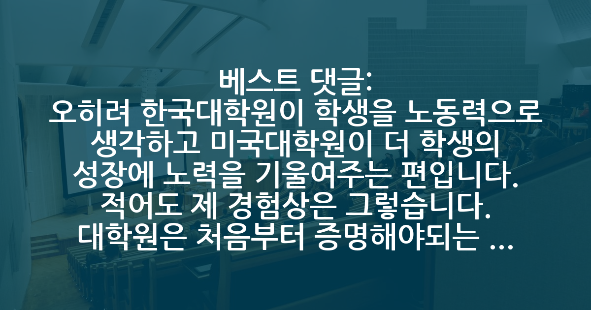 BEST오히려 한국대학원이 학생을 노동력으로 생각하고 미국대학원이 더 학생의 성장에 노력을 기울여주는 편입니다. 적어도 제 경험상은 그렇습니다. 대학원은 처음부터 증명해야되는 곳이 아닙니다. 성장하는모습 보여주면 저절로 증명이 되게 되어있고 교수도 처음부터 잘하면 좋긴하겠지만 그것보다는 본인의 지도를 받고 성장해서 보여주는 학생을 보기를 바랄것입니다. 공부욕심이 있는 분인거같은데 두려움에 본인을 썩히지마시고 준비해서 미국으로 나오시길 바랍니다. 당신같은 분들을 환영하는곳이 미국대학원입니다. 대신에 잘 준비해서 최대한 수준높은 인재가많은 학교로 진학하려고 노력해보세요