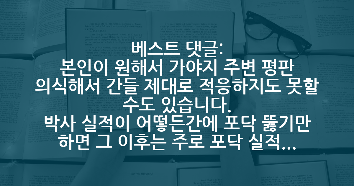 본인이 원해서 가야지 주변 평판 의식해서 간들 제대로 적응하지도 못할 수도 있습니다. 박사 실적이 어떻든간에 포닥 뚫기만 하면 그 이후는 주로 포닥 실적으로 임용뚫어야하기 때문에 큰 의미는 없습니다. 본인 스스로 아카데미아에 뜻이 없다면 그냥 취업하는게 낫습니다.