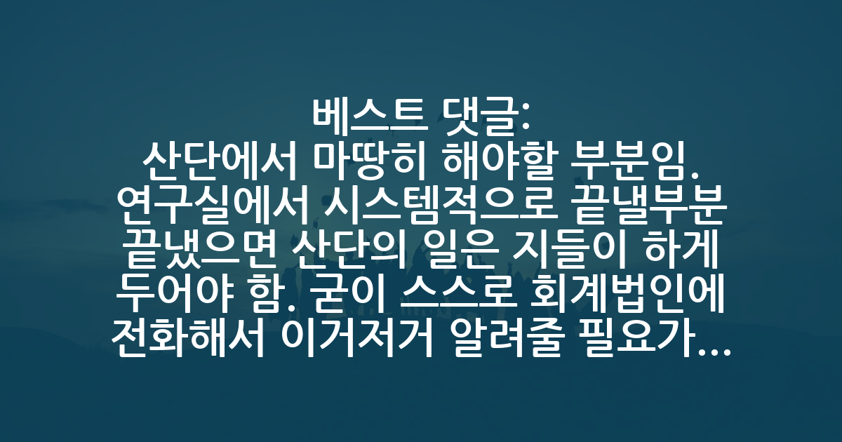 산단에서 마땅히 해야할 부분임. 연구실에서 시스템적으로 끝낼부분 끝냈으면 산단의 일은 지들이 하게 두어야 함. 굳이 스스로 회계법인에 전화해서 이거저거 알려줄 필요가 없음. 궁하면 지네가 전화 할거거든. 책임의 영역이 명확한 시점에서는 씹어도 댐.