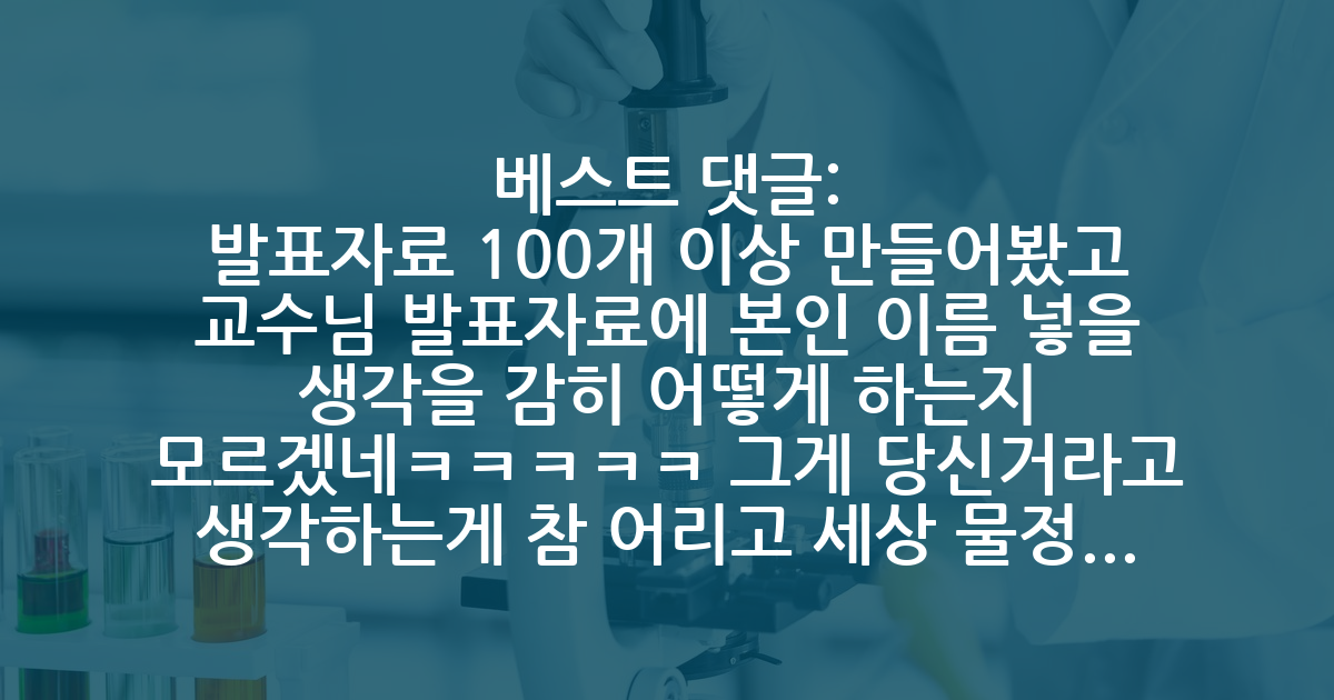 BEST발표자료 100개 이상 만들어봤고 교수님 발표자료에 본인 이름 넣을 생각을 감히 어떻게 하는지 모르겠네ㅋㅋㅋㅋㅋ 그게 당신거라고 생각하는게 참 어리고 세상 물정 모르네. 본인이 그렇게 나서고 싶으면 학위부터 따고 해라.