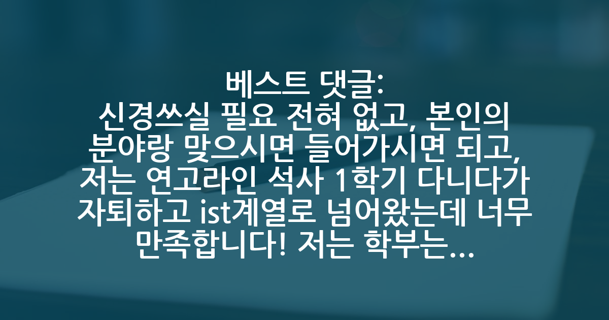 BEST신경쓰실 필요 전혀 없고, 본인의 분야랑 맞으시면 들어가시면 되고, 저는 연고라인 석사 1학기 다니다가 자퇴하고 ist계열로 넘어왔는데 너무 만족합니다! 저는 학부는 건동홍라인이구요!