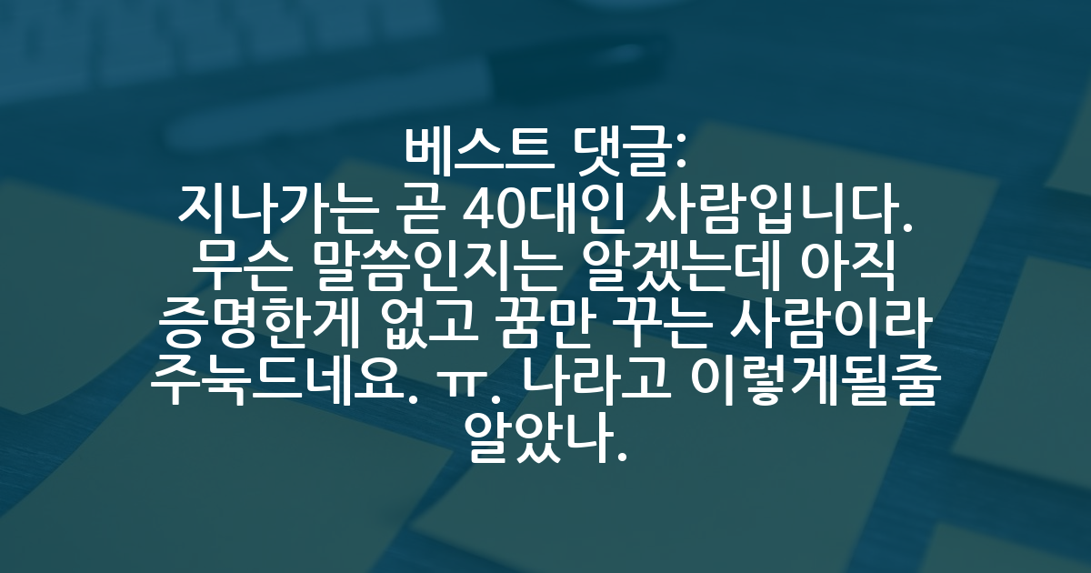 지나가는 곧 40대인 사람입니다. 무슨 말씀인지는 알겠는데 아직 증명한게 없고 꿈만 꾸는 사람이라 주눅드네요. ㅠ. 나라고 이렇게될줄 알았나.
