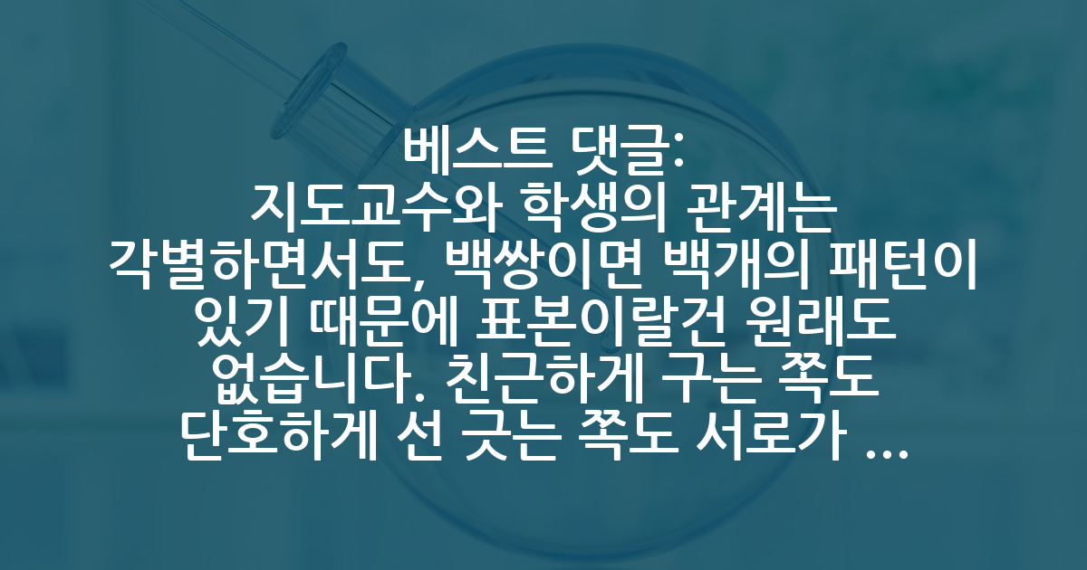 BEST지도교수와 학생의 관계는 각별하면서도, 백쌍이면 백개의 패턴이 있기 때문에 표본이랄건 원래도 없습니다. 친근하게 구는 쪽도 단호하게 선 긋는 쪽도 서로가 잘 맞고 일관성만 있다면야 상관없습니다만.. 저는 애교가 넘치는 것과 다정하고 사교적인 것은 차이가 있다고 생각합니다. 칭찬이나 인정받는 것과도 별개의 문제이구요. 이제 연구자의 길로 들어서면 지도교수와의 대화는 곧 업무 미팅이나 마찬가지입니다. 회사 업무 미팅이나, 뉴스 방송 같은걸 생각해보세요. 딱딱하고 냉정한 분위기를 유지할수도, 밝은 분위기로 친근하게 임할 수도 있겠지만, 펄쩍펄쩍 뛰면서 손으로 하트를 그리거나, 맛있는거 먹으러 가자고 애교섞인 목소리로 호칭하는 것은, 글쎄요. 교수님이 불편하거나 갭차이가 심하다고 느끼기 이전에 프로페셔널한 전문가가 할만한 언행은 아니라고 생각되네요.