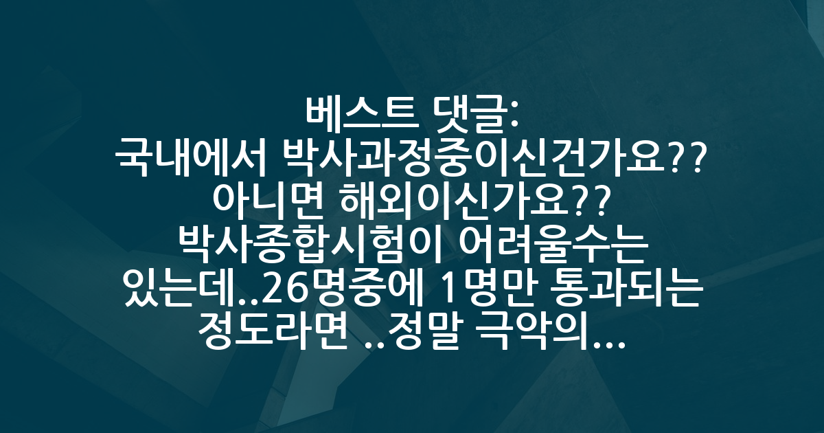 BEST국내에서 박사과정중이신건가요?? 아니면 해외이신가요?? 박사종합시험이 어려울수는 있는데..26명중에 1명만 통과되는 정도라면 ..정말 극악의 난이도인데요...?? 글에는 단순히 박사과정이라 하셧는데, 석박통합이신건가요?? 석사라도 어떻게 취득하시길 바라겟고, 이미 석사를 취득하신거라면, 박사 수료라도 어떻게 안되나요?? 박사종합시험 통과못하면 수료도 어려운건가요?? 제가 이것저것 묻는이유는...이미 벌어진 일은 안타깝지만 어쩔수없고,, 최대한 챙길건 챙겨야 한다는 취지로 말씀드립니다. 5년간 박사과정 하시면서 연구실적은 있으실테고, 그것들을 잘 정리해 두세요. 학위과정 하시면서 수행 프로젝트들도 잘 정리해 놓으시구요... 분명 어렵지만 살 길은 반드시 존재할겁니다.