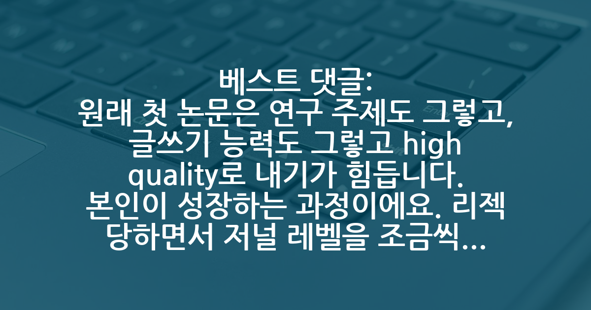 BEST원래 첫 논문은 연구 주제도 그렇고, 글쓰기 능력도 그렇고 high quality로 내기가 힘듭니다. 본인이 성장하는 과정이에요. 리젝 당하면서 저널 레벨을 조금씩 낮춰가면서 내는 게 일반적이기도 하고, 그러다가 운 좋게 높은 데 되기도 합니다. 나중에 돌아보면, '와 저땐 저런걸 가지고도 논문을 냈었네' 생각 드실겁니다. 그만큼 본인이 성장 할 것이기도 하지만, 생각보다 논문이라는 게 별거 없기도 합니다. 본인의 연구 자체를 부정하지 말고 차근차근 다시 힘내보세요. 추가로 리비전 없이 바로 리젝인 경우 그냥 딴 데 내면 그만인거고, 리비전 이후 리젝이 나온거라면 리비전 요령이 좀 필요할 순 있습니다. 보통 comment로 온 것들에 대해서는 정확히 reviewer의 의도에 맞춰 논리적으로 납득이 되도록, 장점을 부각시켜야 합니다. 간혹 A를 물어봣는데 B가 좋기 때문에 문제 없다 라는 정치인 화법으로 작성하는 사람들이 있는데, 이러면 바로 리젝 날아옵니다. 정확히 comment에 온 부분에 대해서만 잘 답변하면 됩니다. 반대로 reviewer 입장에서는 comment에 대한 답변을 받았는데, 논리적으로 깔끔하면 comment 이외의 사유로 리젝 때리기가 쉽지 않습니다.