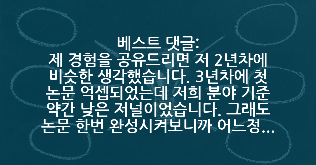 BEST제 경험을 공유드리면 저 2년차에 비슷한 생각했습니다. 3년차에 첫 논문 억셉되었는데 저희 분야 기준 약간 낮은 저널이었습니다. 그래도 논문 한번 완성시켜보니까 어느정도의 감이 있어서 이후 1년 뒤에 Science Advances 억셉되었습니다..! 남들 속도랑 비교하는게 필요할수는 있지만 비교한다고 운적인 요소 (실험 최적화 성공률, 좋은 리뷰어 만나기, 내 주제에 대한 학계의 관심변화) 등을 컨트롤 할순 없더라구요. 그러니 너무 조급해하시지 마시고 조금이라도 여유를 갖고 연구하시기를 권장드릴게요!