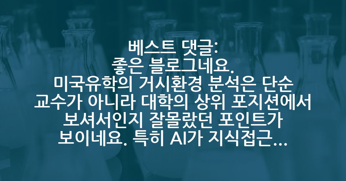 BEST좋은 블로그네요. 미국유학의 거시환경 분석은 단순 교수가 아니라 대학의 상위 포지션에서 보셔서인지 잘몰랐던 포인트가 보이네요. 특히 AI가 지식접근성을 늘렸지만 연구접근성을 늘리지 않았다는 포인트가 와닿습니다. 각 주장마다 좀 더 디테일하게 근거를 알려주시면 행복하겠는데 시간이 없으셨을 것 같습니다. Sop쓰기에 대해서는 방법론에서 한 층위 더 들어가거나 예시를 구체적으로 주시면 좋을 것 같습니다. 저는 이제 grant writing을 배워야할 단계인데.. 심층적인 구체성과 거시적인 통찰 사이 어딘가에서 길을 잃곤 합니다.