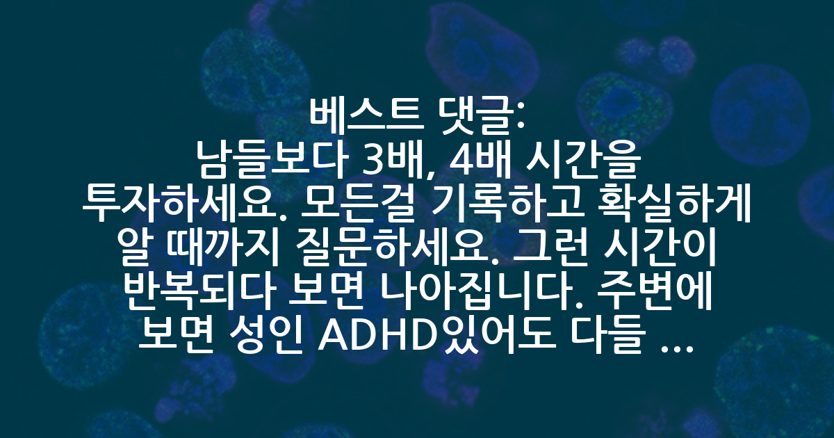 BEST남들보다 3배, 4배 시간을 투자하세요. 모든걸 기록하고 확실하게 알 때까지 질문하세요. 그런 시간이 반복되다 보면 나아집니다. 주변에 보면 성인 ADHD있어도 다들 잘만 박사하더이다.