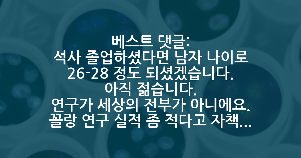 BEST석사 졸업하셨다면 남자 나이로 26-28 정도 되셨겠습니다. 아직 젊습니다. 연구가 세상의 전부가 아니에요. 꼴랑 연구 실적 좀 적다고 자책하실 필요 전혀 없습니다. 살기 싫다니요? 당장은 시간을 허비한거라 생각드시겠지만, 분명 석사과정 동안 무언가를 배우셨을 것이라 생각합니다. 방에서 노는거 빼고 시간 허비란 없습니다. 단지 밀도의 차이일 뿐이죠.