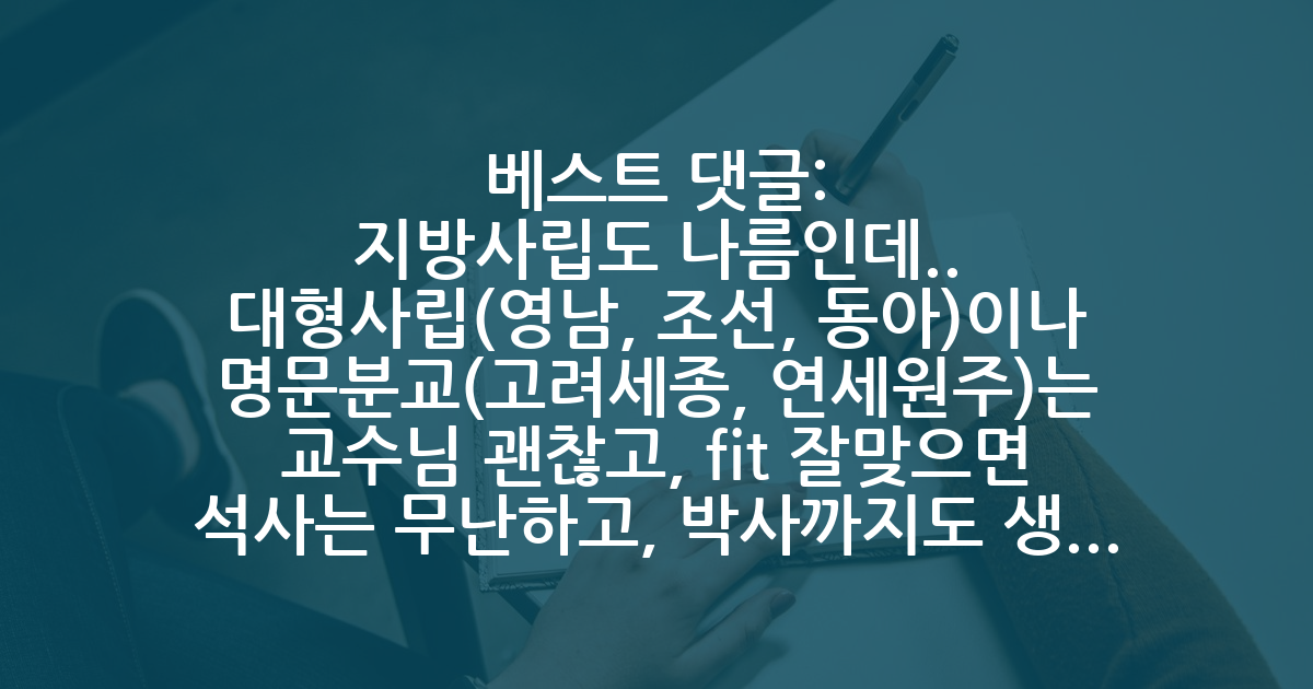 BEST지방사립도 나름인데.. 대형사립(영남, 조선, 동아)이나 명문분교(고려세종, 연세원주)는 교수님 괜찮고, fit 잘맞으면 석사는 무난하고, 박사까지도 생각해도 될 수 있지만요.. 그 이하는 우선 대학원이 활성화 되있는지부터 확인이 필요합니다. 글쓴이 자대가 어딘진 모르겠으나, 가려는 교수님 연구실에 사람도 있고 졸업생도 있고 실적도 무난히 나온다면 안갈이유는 없죠. 그러나 대학원생도 거의 없고, 졸업 이후 진로 정보도 없으면.. 도박은 안하시는걸 추천하구요.