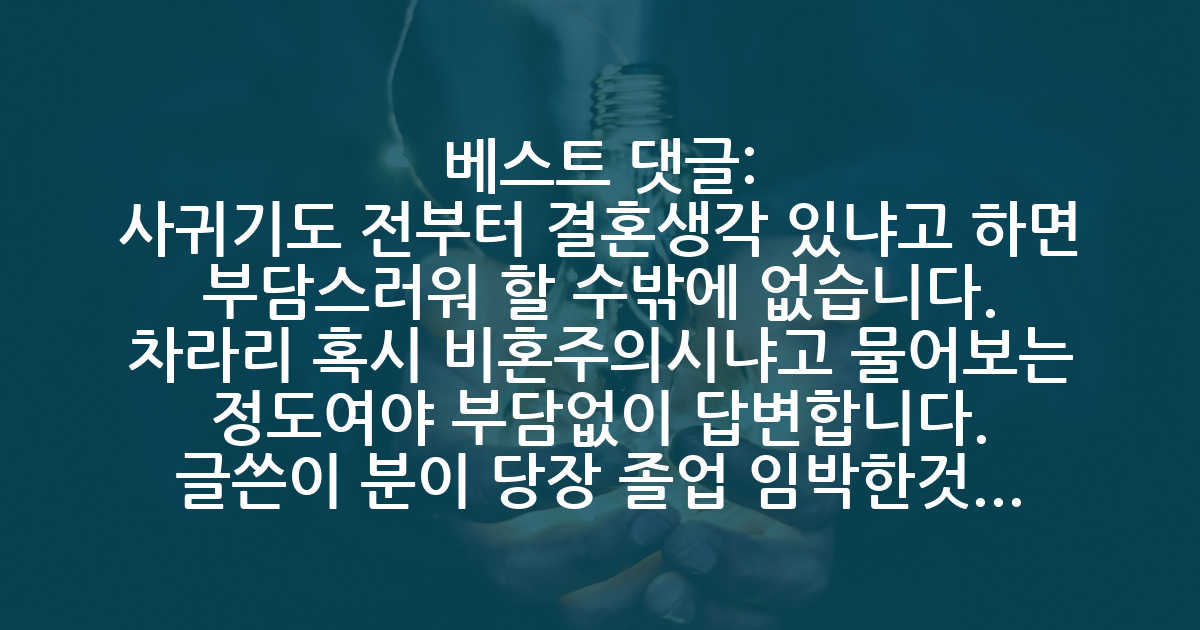 BEST사귀기도 전부터 결혼생각 있냐고 하면 부담스러워 할 수밖에 없습니다. 차라리 혹시 비혼주의시냐고 물어보는 정도여야 부담없이 답변합니다. 글쓴이 분이 당장 졸업 임박한것도 아니고, 여자분이 장기연애 원한다고 하니 어짜피 천천히 연애하면서 졸업 후 결혼 각 보시는 것이 좋습니다. 오히려 빠른 결혼 원하는 여자면 님 같은 상황의 대학원생 감당 못합니다. (졸업이 꽤 남은)