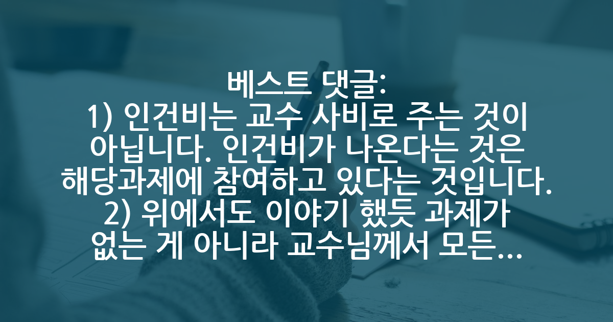 BEST1) 인건비는 교수 사비로 주는 것이 아닙니다. 인건비가 나온다는 것은 해당과제에 참여하고 있다는 것입니다. 2) 위에서도 이야기 했듯 과제가 없는 게 아니라 교수님께서 모든일을 맡아주고 계신겁니다. 지시가 없는 이유는 여러가지가 있을 수 있습니다. 선배들이 해둔 것으로 목표를 어느 정도 달성해둔 상황일 수 있고 아직은 바쁜 시기가 아닐 수 있습니다. 그리고 본인이 과제에 참여하고 있는지도 모르는 사람을 당장 하나하나씩 가르치기에는 교수님께서 짬이 안나실 가능성이 높습니다. 그러니 그냥 공부나 하고 있으라고 한 것이죠. 3) 다른 사람은 어떻게 생각할지 모르겠으나 학부 정도는 졸업했으면 뭐든 스스로 찾아서 할줄 알아야 된다고 생각합니다. 현재 참여하고 있는 과제에 대해 완벽히 파악하고 있어야 한다는 이야기 까진 안하겠지만 전공 공부하고 논문을 읽으면서 앞으로의 일에 대한 준비는 스스로 해둬야 합니다. 본인은 그정도 준비도 안하면서 불만만 하는 건 썩 좋아보이지 않네요.