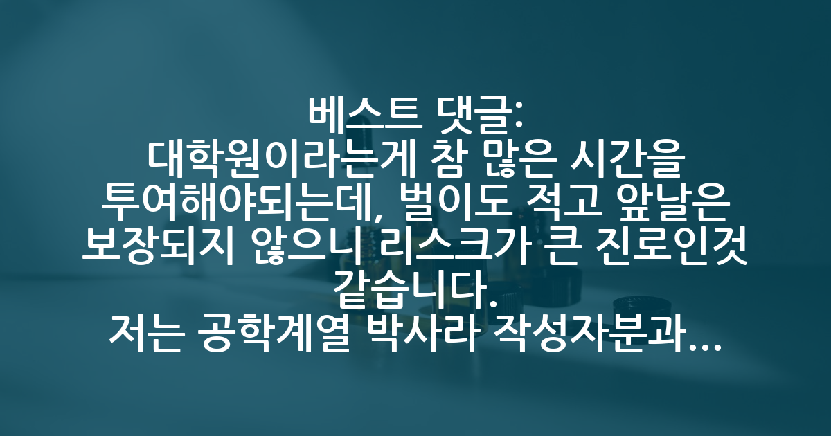 BEST대학원이라는게 참 많은 시간을 투여해야되는데, 벌이도 적고 앞날은 보장되지 않으니 리스크가 큰 진로인것 같습니다. 저는 공학계열 박사라 작성자분과 같은 미술계열은 잘 모르지만 대학원이라는 맥락에서는 비슷한 점이 있겠네요. 이렇게 리스크가 큰 대학원을 왜 갈까요? 다들 처음에는 그에 대한 각자의 답이 있었을 겁니다. 취업이 안돼서, 하고싶은 일이 있어서, 연구가 재밌어보여서, 교수가 되고싶은데 대학원을 가야돼서...등이 있겠네요. 결국 그 답이 힘든 대학원을 버티는 동기가 됩니다. 그래서 항상 저는 연구에 열정이 있거나, 하고싶은 일이 석박사를 요구하거나 그런 강렬한 동기가 없다면 대학원 진학을 말립니다. 작성자분도 처음의 그 동기를 떠올려보세요. 그럼 계속 다녀야하는가에 대한 대답을 스스로 찾으실 수 있을겁니다.