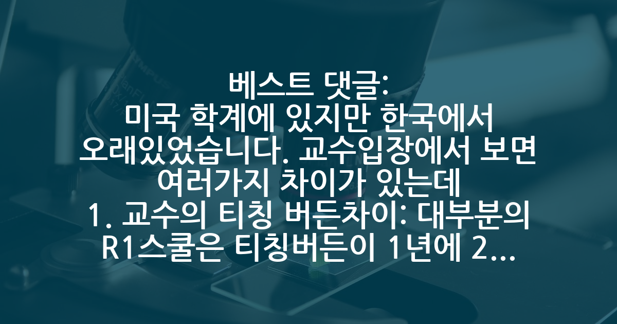 BEST미국 학계에 있지만 한국에서 오래있었습니다. 교수입장에서 보면 여러가지 차이가 있는데 1. 교수의 티칭 버든차이: 대부분의 R1스쿨은 티칭버든이 1년에 2과목, 아주가끔(혹은 태뉴어이후) 3과목 입니다. 반면 한국은 연구중점대학 극소수를 제외하면 대체로 티칭버든이 엄청많음. 2. 교수의 기타 업무차이: 미국은 흔히 교내 서비스 업무로 구분되는 일이 매우 적음. 태뉴어받기전에는 일 아예 안시키며, 그 전후라고 해도 서칭커미티 정도의 업무를 함. 한국은 위에서 아래로 내려오는 업무가 엄청많음. 한국문화 자체가 교수-학생의 수직문화도 있지만, 교수내에서도 시니어-주니어까지의 수직문화도 분명존재하며 학과업무가 (예를들면 bk등) 쓸데없이 많음. 3. 연구실적 버든: 태뉴어는 분명 중요한지표이며, 미국이 더 빡센경우가 많음. 하지만 미국은 정성적인 평가를 어느정도 하지만 한국은 거의 철저히 정량적인 실적을 요구함. 또한 과제내에서도 정량적인 논문실적을 요구하는 기이한 형상이 있기에, 연구에 대한 압박이 꽤높음.