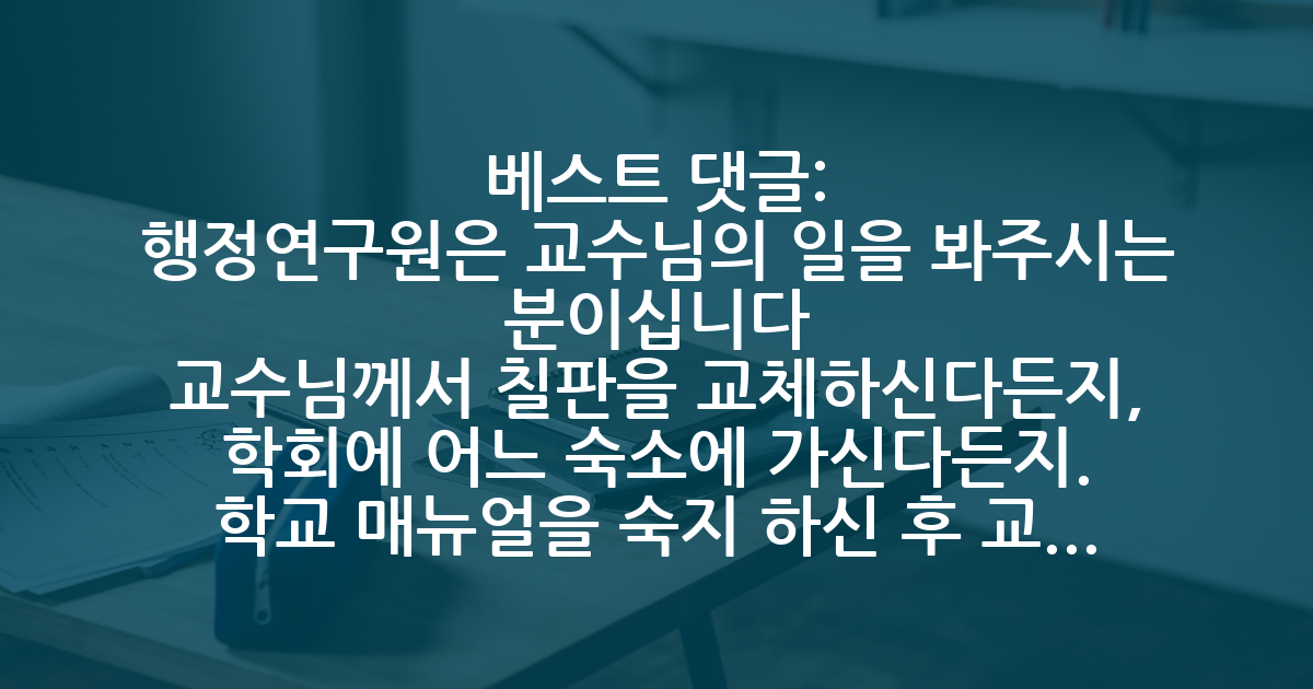 행정연구원은 교수님의 일을 봐주시는 분이십니다 교수님께서 칠판을 교체하신다든지, 학회에 어느 숙소에 가신다든지. 학교 매뉴얼을 숙지 하신 후 교수님께 정보를 주시기도 하시고 학교와 교수님 사이에 중재 역할이나 행정적인 일을 봐주십니다 물론 랩실에 있는 일도 일부 도와주실 것입니다