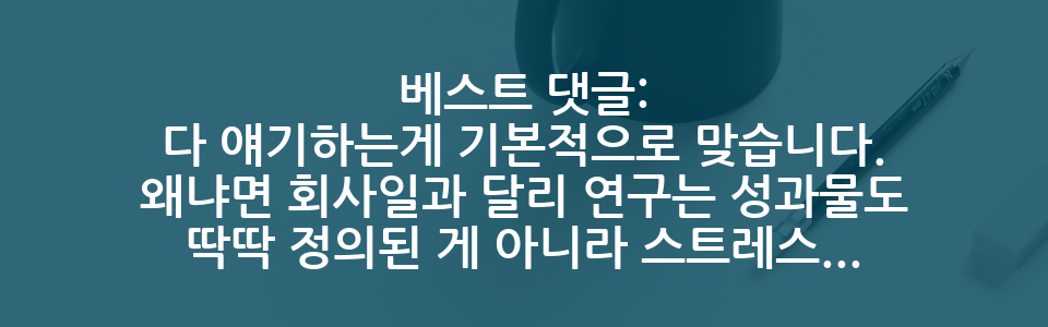 BEST다 얘기하는게 기본적으로 맞습니다. 왜냐면 회사일과 달리 연구는 성과물도 딱딱 정의된 게 아니라 스트레스 받는 것도 크니까요. 교수에게 자신의 스트레스를 가감없이 얘기하는게 낫습니다. 교수도 비슷한 길 대부분 거쳐왔기 때문에 백프로 이해하고 고려합니다. 다만 응석부리는 것과는 구분해야하겠죠. 내 정신적 혹은 개인적 상황이 내 연구에 어떻게 영향을 끼치고 있는지 차분하게 말하는 건 무조건 필요하다고 봅니다. 그게 아니라 조용히 골방에 들어가 끙끙대다 생산력이 떨어지면 서로에게 안좋아요.