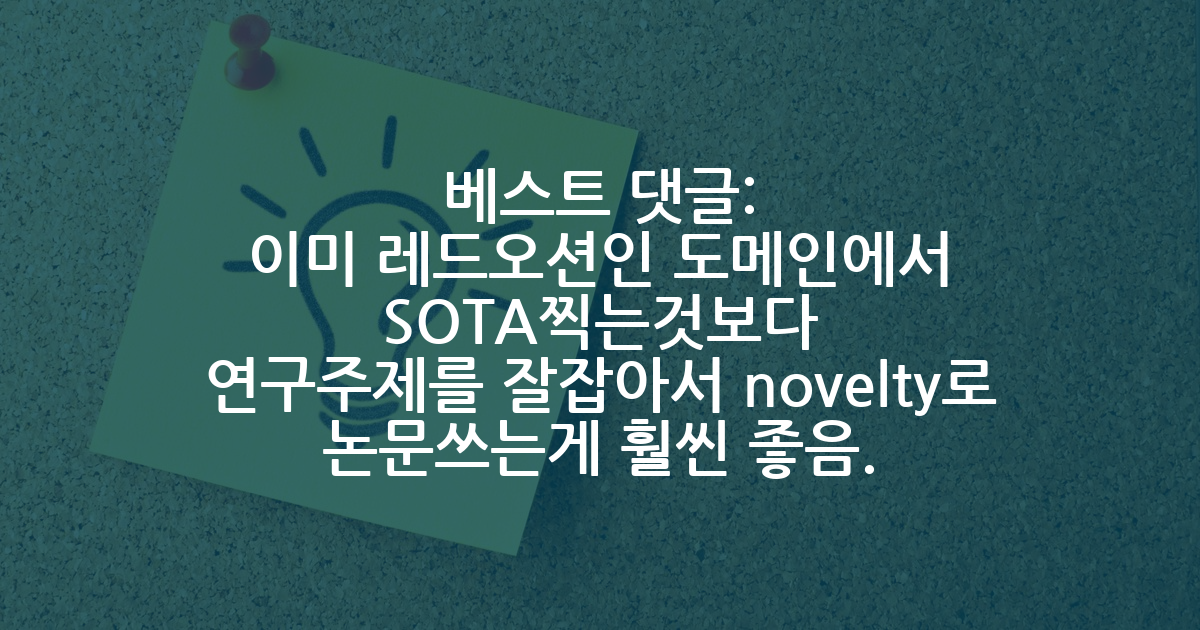 BEST이미 레드오션인 도메인에서 SOTA찍는것보다 연구주제를 잘잡아서 novelty로 논문쓰는게 훨씬 좋음.