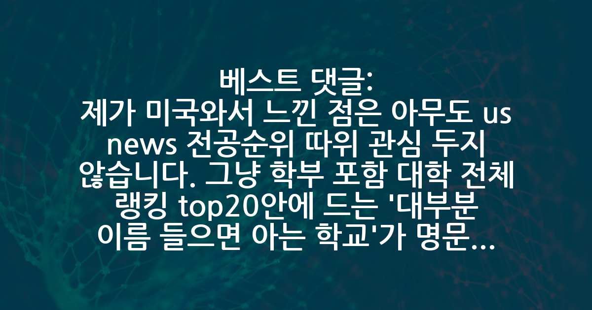 BEST제가 미국와서 느낀 점은 아무도 us news 전공순위 따위 관심 두지 않습니다. 그냥 학부 포함 대학 전체 랭킹 top20안에 드는 '대부분 이름 들으면 아는 학교'가 명문대로 인식되는 정도입니다. 결국에 가장 중요한 것은 지도교수라는 말에는 100프로 동의합니다. 특정 전공순위가 특히 높은 학교가 있다면, 아마도 유명한 교수가 그 학교에 있겠죠. 하지만 해당 지도교수의 방을 들어가지 못한다면 전공순위에 무슨 의미가 있겠습니까. 굳이 학교를 가지고 비교를 한다면 그냥 학부 전체 서열에서 순위가 높은 인지도 높은 학교가 좋습니다.