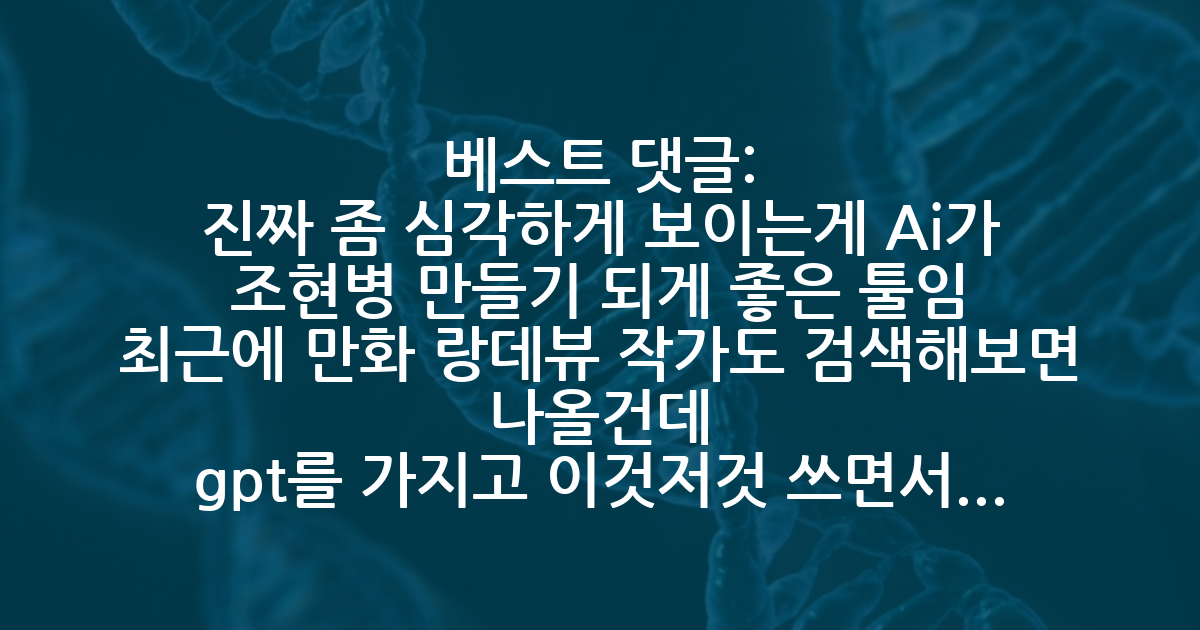 BEST진짜 좀 심각하게 보이는게 Ai가 조현병 만들기 되게 좋은 툴임 최근에 만화 랑데뷰 작가도 검색해보면 나올건데 gpt를 가지고 이것저것 쓰면서 gpt는 자아가 있다. 나는 gpt가 인정한 상위 0.1% 지능 보유한 사람이며 gpt 해킹에 성공했다 이런 글을 작성함.