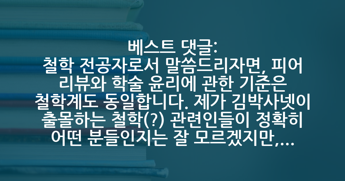 BEST철학 전공자로서 말씀드리자면, 피어 리뷰와 학술 윤리에 관한 기준은 철학계도 동일합니다. 제가 김박사넷이 출몰하는 철학(?) 관련인들이 정확히 어떤 분들인지는 잘 모르겠지만, 아마도 전공자가 아니시거나 적어도 학계에서 활발하게 활동하는 분들은 아닌 게 분명해 보입니다. 그런 수준의 글로 전문 철학 저널의 출판에 성공할 가능성은 없을 테니까요. 인문계가 이공계에 비해 접근 문턱이 낮아 보이는 면이 있어, 전문 어그로꾼들의 타깃이 되는 경우가 종종 있는 것 같습니다. 하지만 진지하게 철학을 공부하는 대학원생, 선생님들은 작성자님이 말씀하시는 이공계의 윤리와 덕목을 큰 틀에서 공유하고 있을 뿐 아니라, 정돈된 평가와 논쟁이 성립하는 종류의 학술적 작업물을 생산하고 있다는 점을 말씀드리고 싶네요.