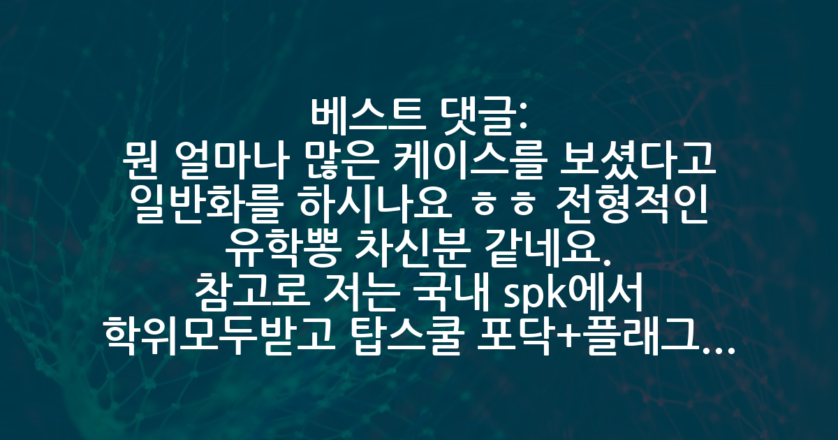 BEST뭔 얼마나 많은 케이스를 보셨다고 일반화를 하시나요 ㅎㅎ 전형적인 유학뽕 차신분 같네요. 참고로 저는 국내 spk에서 학위모두받고 탑스쿨 포닥+플래그쉽 주립대 임용된 케이슨데, 한국많은 학교의 연구 수준이 절대 낮지 않습니다. 글쓴이분의 극소수 케이스 보고 "한국박사과정이 실험컨셉도 이해못하더라" "중국신 논문찍어내기가 심하다" 등등의 평가절하를 하려고 하시는듯 합니다. 그냥 논문이 많은사람이면 그 사람을 통해서 배우시면 됩니다. 거기에서 어떻게든 "말도 안된다" 등으로 상대방을 낮춰서 본인이 더 우수하다고 말 안하셔도 됩니다. 저또한 논문편수가 꽤 많은편이고, 그중 탑저널도 세개 있었습니다. 그중 한개는 해외포닥 넘어와서 쓴거고요. 논문 많이쓰시다보면 연구를 하기전에 대충 어느정도 수준이 될지 보입니다. 기여도가 없이 흥미만으로 시작된 논문은 에디터든 리뷰어를 설득하기 힘듭니다. 반대로 연구많이하시면서 그런 연구 기여도를 빠르게 잡아내실수있으면 단기간이여도 좋은 연구하실수 있는거고요. 제 PI지도교수도 제 그 능력을 높게 평가해주셨고요. 근데 이런 insight는 논문 많이 보고, 또 써봐야지 생기는 거라고 생각합니다. 여기에서 말씀하시는 의도가 다분히 보이는데, 본인은 혹시 모르시고 쓰신글일까요? 저는 반대로 글쓴이분의 자존감이 굉장히 아쉽네요.