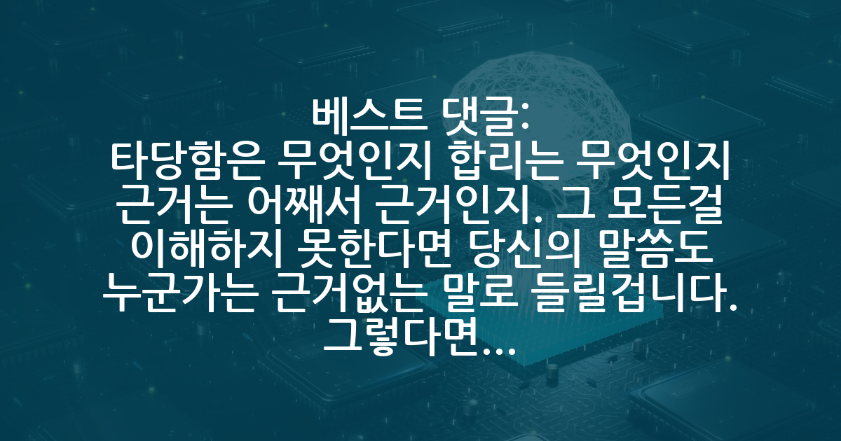 BEST타당함은 무엇인지 합리는 무엇인지 근거는 어째서 근거인지. 그 모든걸 이해하지 못한다면 당신의 말씀도 누군가는 근거없는 말로 들릴겁니다. 그렇다면 이해의 판단기준은 결국 자기자신에게 있다는 말이죠. 사람은 자신의 무지와 무능을 타인에게 전가하는것이 항상 관성적으로 내재되어 있습니다. 당신께서 하신말씀도 그와 비슷하시네요. 동의하고 동감합니다.