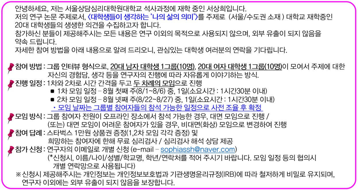 집단 인터뷰 모임 - (대학 재학중인 20대학생)참가자를 모집합니다.